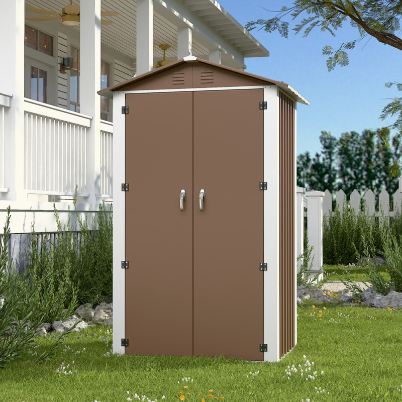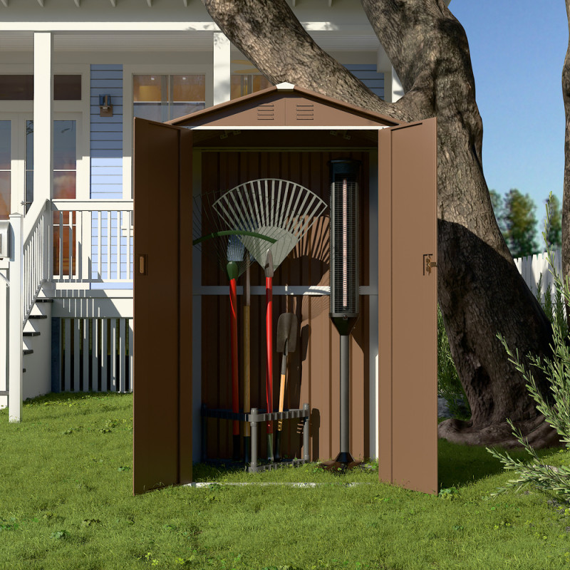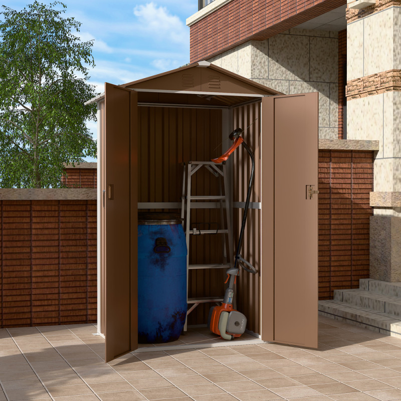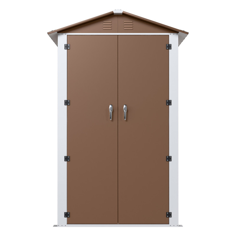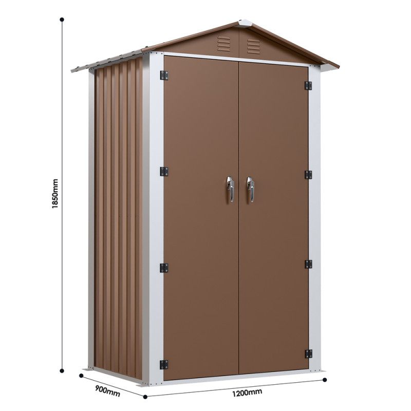 Металевий госпблок-сарай DS-01 з двосхилим дахом у коричневому кольорі — практичне та довговічне рішення для організації зберігання садового інвентарю, інструментів, техніки та господарських речей на подвір’ї, дачі або біля приватного будинку. Конструкція виготовлена зі сталі з антикорозійним покриттям, що забезпечує тривалий термін служби та стійкість до впливу навколишнього середовища.
