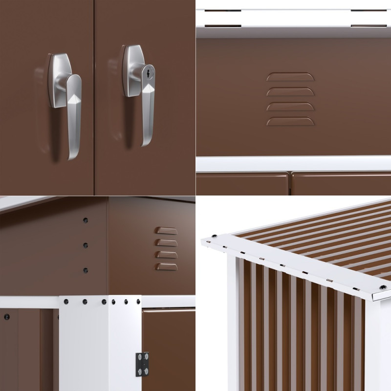 - Профлист - високоякісна оцинкована сталь - Каркас і двері - холоднокатана сталь - Товщина: зашивки 0.35-0.45 мм, каркас 1.0-1.2 мм - Колір павільйону: коричневий - Покриття: епоксидно-порошкове полімерне
