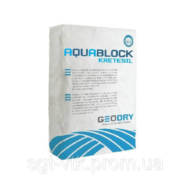 Осмотичний гідроізоляційний мінеральний гель AQUABLOCK KRETESIL. Мішок: 25 кг. AQUABLOCK KRETESIL - це мінеральний гель з осмотичним гідроізоляційним проникненням на основі гідравлічних сполук, спеціальних гідрофобних агентів і синтетичних смол. Він може застосовуватися на всіх бетонних поверхнях або кам'яних кладках, за умови, що вони міцні і цілістні. Має сильну адгезію до основи, також водонепроникний в тонкому шарі, легко наноситься. AQUABLOCK KRETESIL - стабілізує розчинні компоненти цементу з утворенням нерозчинної кристалізації в капілярних шляхах основи. Це дозволяє створити стійкий фізичний бар'єр, який ущільнює пори конструкцій, протидіючи позитивному чи негативному тиску води, зберігаючи відмінну повітропроникність. AQUABLOCK KRETESIL - може застосовуватися для гідроізоляції споруд з позитивним гідравлічним тиском, таких як басейни, резервуари, очисні споруди, фундаментні стіни, плінтуси, збірні резервуари, греблі, канали або з негативним гідравлічним тиском, таких як тунелі, вологі приміщення, шахти ліфт обслуговування. Відповідає Європейському Стандарту EN 1504-2 ( «Системи захисту бетонних поверхонь») покриття (C) відповідно до принципів MC (контроль вологості) і IR (збільшення питомої опору). Для приготування суміші залити в ємність, з розрахунку 5,5-6 літрів чистої води (в залежності від інструменту, що використовується для його застосування) на один мішок AQUABLOCK KRETESIL- 25 кг, перемішати механічним міксером на низьких оборотах, щоб уникнути надмірного захоплення повітря. Перемішувати суміш протягом приблизно 5 хвилин, поки не зникнуть грудки і суміш не стане однорідною, переконатися, що на дні і стінках ємності не залишилося не переміщених часток порошку. Залишити суміш на 5-10 хвилин, попередньо перемішати перед використанням, до отримання однорідної консистенції. Нанесення AQUABLOCK KRETESIL можна робити: за допомогою пензля, не менше двох або трьох шарів нанесення (в залежності від типу застосування), дотримуючись обережності при нанесенні кожного наступного шару, після достатнього затвердіння попереднього (приблизно через 4-5 годин, в залежності від умов навколишнього середовища і пористості підстави, які не перевищувати 24 годин); за допомогою шпателя, використовуючи для приготування суміші приблизно 5-5,5 літрів води, що б отримати менш текучу консистенцію. Однак переважно наносити перший шар пензлем; за допомогою розпилювача, використовуючи штукатурну машину, наносити розчин не менше двох проходів, дотримуючись обережності при нанесенні кожного наступного шару, після достатнього затвердіння попереднього, при загальній товщині не більше 4 мм.