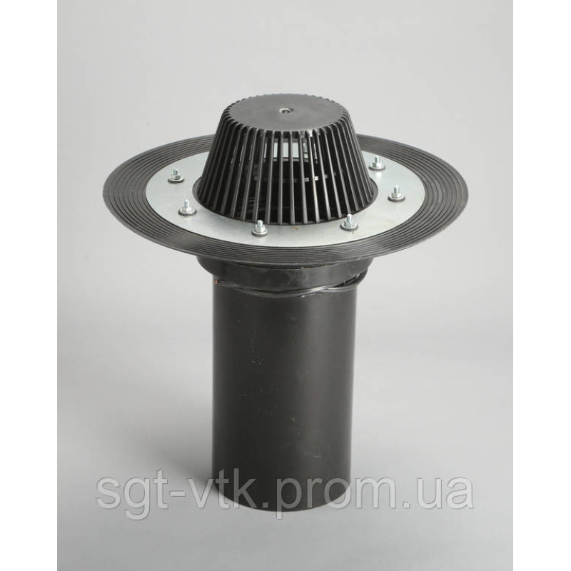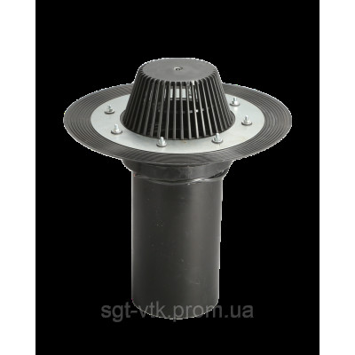 Покрівельна воронка зі збільшеним корпусом для більшого прилягання гідро-, пароізоляційних матеріалів до воронки, а її корпусу до площини покрівлі, з прижимним фланцем з нержавіючої сталі, електрообігрівом, листоприймачем, вертикальним виходом, діаметром 160 мм і висотою 345 мм.