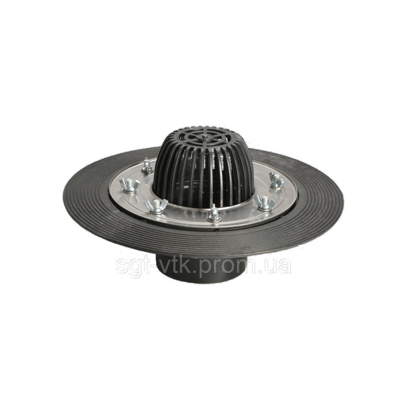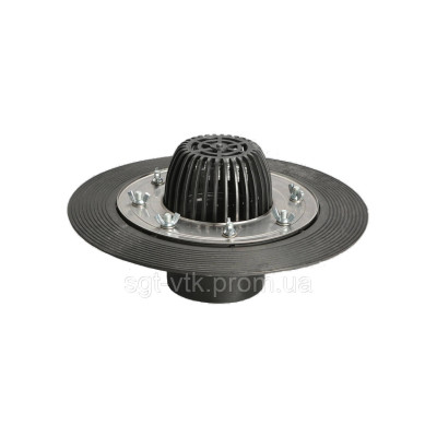 Покрівельна воронка зі збільшеним корпусом для більшого прилягання гідро-, пароізоляційних матеріалів до воронки, а її корпусу до площини покрівлі, з листоприймачем, вертикальним виходом, діаметром 110 і висотою 100мм.