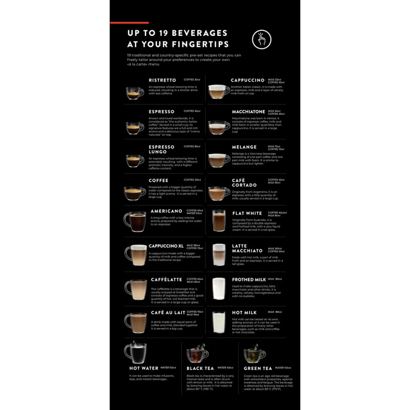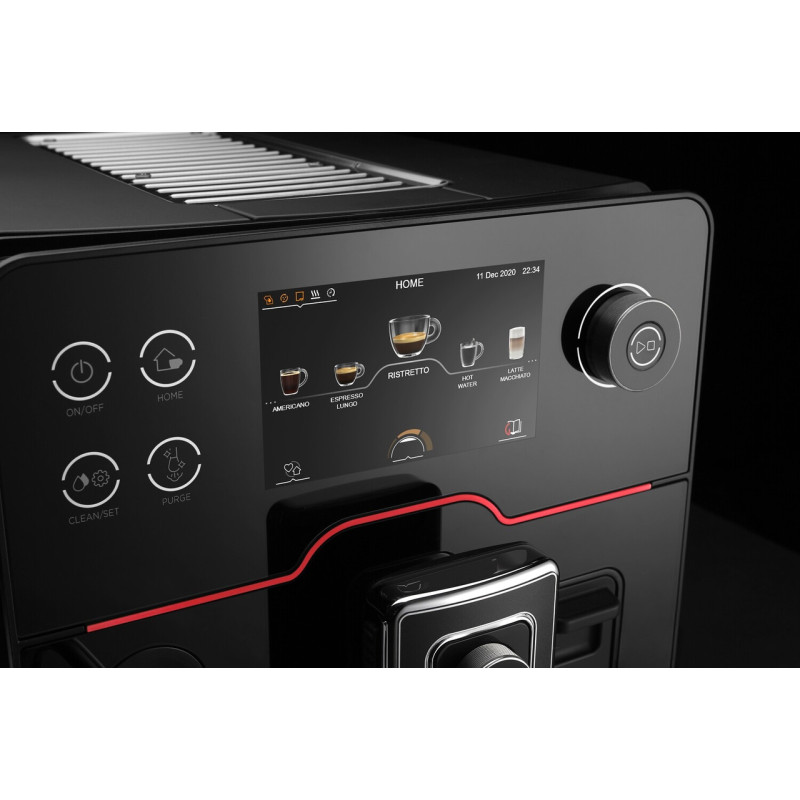 Новинка 2023 року, автоматична кавомашина преміум-класу GAGGIA NEW ACCADEMIA На 100% розроблено та вироблено в Італії. Італійський майстер дизайн та технології. Gaggia Accademia використовує такі матеріали найвищої якості, як нержавіюча сталь, метал Zama та чорне дзеркальне скло. Збагачений деталями преміум-класу, такими як червона лінія з підсвічуванням або дорогоцінна текстура поворотних ручок, має оптимальну площу основи. 5-дюймовий повнокольоровий сенсорний екран з 3D іконками і кнопками з підсвічуванням має підвищену чутливість, що гарантує максимальну зручність роботи. Прокручуйте та перегортайте меню, натискайте та вибирайте напої або керовані процедури точним та простим способом. Завдяки сенсорній клавіатурі ви навіть можете перейменувати свої напої на власний розсуд. Компактний, ергономічний і простий у використанні молочний графин. Професійний паровий стимер виконаний з нержавіючої сталі з правильним дизайном та розмірами для професійного приготування молочної піни з ідеальною текстурою для латте-арту та приємним солодким смаком. Міцний корпус із нержавіючої пофарбованої сталі забезпечує довгий термін служби кавомашини. Ефективний підігрівач чашок із таймером для активації до 4 разів на день підігріву чашок у будь-який час. Спробуйте 19 традиційних та сучасних напоїв з усього світу: RISTRETTO, ESPRESSO, ESPRESSO LUNGO, COFFEE, AMERICANO, CAPPUCCINO XL, CAFFELATTE, CAFÈ AU LAIT, CAPPUCCINO, MACCHIATONE, MELANGE, CAFÈ CORTADO, FLAT WHITE, LATTE MACCHIATO, FROTHED MILK, HOT. Налаштуйте свої рецепти до найдрібніших деталей та збережіть їх в одному з 4 доступних профілів користувачів, щоб щодня отримувати напої за вашим індивідуальним рецептом одним натисканням кнопки. Найвища свобода вибору у найкоротші терміни. Стати домашнім баристом майбутнього. Інтерфейс: Повнокольоровий сенсорний дисплей, ємнісні кнопки та поворотні регулятори з підсвічуванням Дисплей : Повноцінний сенсорний 5-дюймовий дисплей Кількість мов : 21 Різноманітність напоїв: 19 напоїв + пар для латте-арту Профілі : 4 Функція пам'ятки: Через профілі, збереження об'єму при заварюванні Молочне рішення: Вбудований графін; професійна парова насадка Зазор між носиками для кави: 7,5 см - 16,5 см (без знімної частини) Підігрів чашок: Активний, з таймером пробудження Керамічна кавомолка: ✔ (8 рівнів) Налаштування аромату: 5 налаштувань + Coffee Boost (для більш насиченої кави (≥ 50 мл)) Кількість напоїв: 19 напоїв + пар для латте-арту Тиск насоса: 15 бар Попереднє наполягання: ✔ (3 рівні) Налаштування температури: ✔ (3 рівні) Регульований об'єм напою: ✔ для кави, молока, води Регульована гучність під час заварювання ✔ Функція «На льоту Регульований рівень піни ✔ (4 рівні) Об'єм резервуару для води: 1,6 l Об'єм молочного графину: 0,6 l Об'єм для кавових зерен: 350 g Контейнер для відпрацьованої кави: 14 порцій Приладова панель стану машини: ✔ Одиниці виміру: мл - унція Налаштування часу роботи в режимі очікування: ✔ регульована (з можливістю встановлення режиму ECO MODE) Встановлення дати та годинника: ✔ Скидання заводських налаштувань : ✔ Налаштування жорсткості води: ✔ Тип фільтру для води Сумісний з Intenza+ Цикли очищення молочного контуру : Швидке очищення, Глибоке очищення, Гігієна пором Цикл видалення накипу: ✔ автоматичний Продування парового стимера: ✔ за допомогою прямої кнопки Розміри виробу (Д х В х Г): 28,2 x 38,5 x 42,8 см. Вага: 13,8 кг Корпус : Нержавіюча сталь Передня панель: Чорне дзеркальне 
