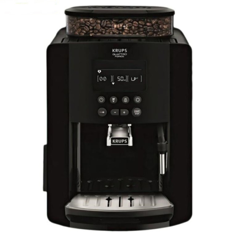 Автоматична кавоварка Krups EA8170 виконана в лаконічному сучасному дизайні в стильному чорному кольорі. Вона призначена для настільної установки та готує напої із зерен та меленої кави. Потужність апарату складає 1450 Вт, тиск, що створюється, – 15 бар, а для комфортного керування на фронтальній панелі є кнопкова панель і LCD дисплей. У контейнер, розташований зверху, міститься 260 грам зерен кави. Безпосередньо перед приготуванням кавові зерна мелються металевими жорнами вбудованого млина, при цьому ступінь помелу регулюється 3 рівнями. Користувач може задавати три ступеня міцності кави, вибирати обєм порції та встановлювати дозатор подачі напою під чашку заввишки до 108 мм. У ручному режимі модель готує популярний напій капучіно із молочною піною. Автоматична кофемашина Krups EA8170 оснащена функцією програмування, а гігієнічне очищення приладу здійснюється автоматично спеціальною вбудованою системою.