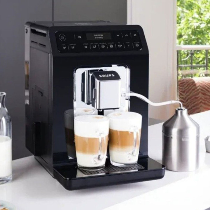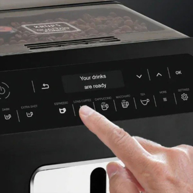 Тип кавоварка Тип приготування автоматичне Використовувана кава в зернах Кількість чашок, шт 2 Обсяг резервуара 2.3 л Потужність 1450 Вт Тиск 15 бар Вбудована кавомолка Функції автовідключення, регулювання міцності кави, автоматична промивка системи, 3 налаштування рівня міцності, 3 рівня регулювання температури кави, регулювання температури, регулювання ступеня мелення, Extra shot, функція додаткової порції еспресо Колір чорний Особливості зйомний піддон для крапель, система KRUPS Quattro Force, знімний капучинатор, подача гарячої води для чаю, система One-Touch-Cappuccino