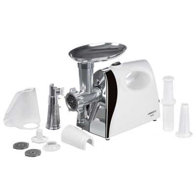 Колір корпусу: білий Продуктивність: 2.0 кг/хв Функція реверсу Система захисту від перенавантаження Решітки трьох типів (3мм, 5мм та 7мм) Насадки для приготування домашньої ковбаси та кеббе Насадка соковижималка для томатів Місткий завантажувальний лоток, зручний штовхач, знімний шнек Вбудована ручка для перенесення