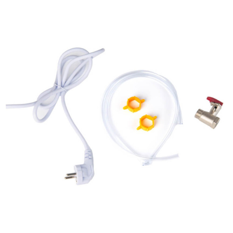 Бойлер имеет удобное подключение коммуникаций в верхней части корпуса, а его компактные габариты (25.1×25.1×38.6 см) и вес 5.9 кг делают монтаж легким и быстрым. Благодаря возможности установки на полу или полке, он не нуждается в креплении к стене, что добавляет удобства в размещении.