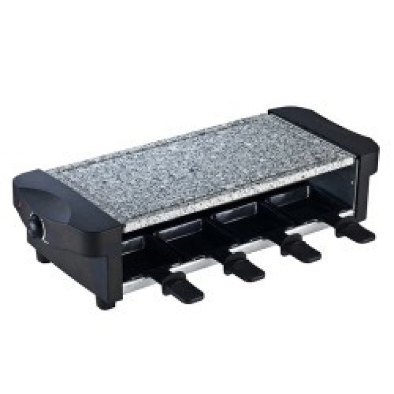 Отличительной чертой раклетниц-гриль из серии KELA Ceneri служит большая массивная плита из цельного гранита, которая под воздействием электрического тока равномерно разогревается по всей своей поверхности и длительное время сохраняет рабочую температуру, не требуя постоянного нагрева, что значительно экономит электроэнергию в процессе приготовления пищи. Располагается эта плита на верхнем ярусе. Под ней, на нижнем ярусе расположена рамка, совмещенная с нагревательными элементами, на которую устанавливаются восемь мини-сковородок с антипригарным покрытием. На боковой панели раклетницы KELA Ceneri расположен механический регулятор степени нагрева рабочей зоны с функцией автоотключения в случае перегрева. Раклетница-гриль KELA Ceneri предназначена для приготовления мясных, рыбных и овощных блюд на гриле как в закрытых помещениях, так и на свежем воздухе, в пределах доступности электрической сети. Идеально подходит для неспешного времяпрепровождения с горячими закусками в компании из 8 человек. После приготовления пищи гранитную плиту достаточно сполоснуть под теплой проточной водой или протереть мокрой кухонной губкой, а мини-сковородки можно вымыть как под проточной водой, так и в посудомоечной машине.