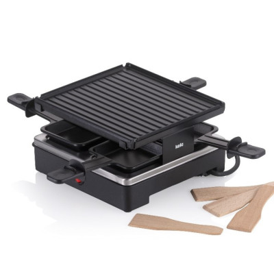 Хотите снова устроить уютный раклетный вечер? Практическая деталь этой модели в том, что противни можно снимать или вставлять со всех сторон. Это особенно удобно за круглыми столами или когда вы не сидите во главе. Раклетница на 4 человек имеет матовую поверхность из литого алюминия с антипригарным покрытием, состоит из: 1 пластина для гриля из литого алюминия, одна сторона с желобками, одна без них - 4 сковороды из стали с антипригарным покрытием, 4 деревянные лопатки. Размер: 21,5х21,5х12см. Кабель длиной 2 м.