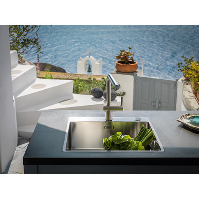 Смеситель с боковым размещение ручки управления. Вытяжной излив дает возможность наполнять емкости вне чаши мойки. Ламинарный поток – легкий, тихий и прозрачный поток воды без разбрызгивания. Поток воды – 9.7 л/мин (3 бар)