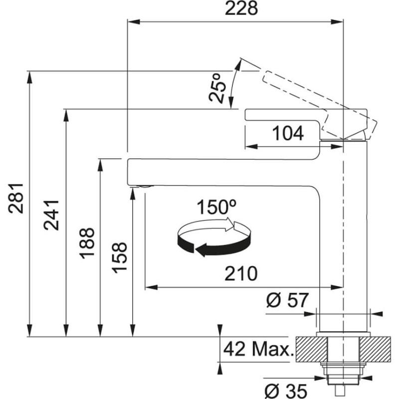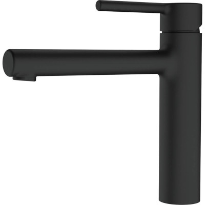 Смеситель с верхним размещение ручки управления. Имеет фиксированный излив, который не вытягивается. Смеситель может экономить воду благодаря тому, что картридж имеет промежуточное положение с неполным открытием. Ламинарный поток – легкий, тихий и прозрачный поток воды без разбрызгивания. Поток воды – 12 л/мин (3 бар)