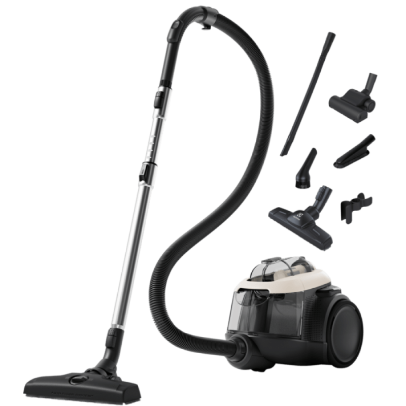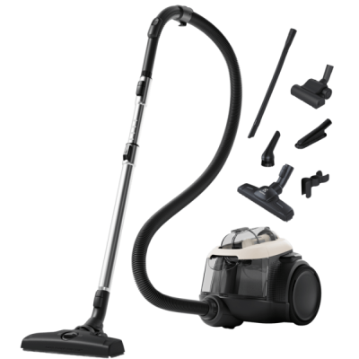 Без мішка: пил збирається у пластиковий контейнер. Достатньо витягти контейнер, витрусити його та встановити назад. Вам більше не доведеться купувати пилозбірники! Вбудовані фіксатори для насадок: простота фіксації насадок як у вертикальному, так і горизонтальному положенні. Регулювання потужності: регулювальник дозволяє встановлювати бажану потужність. Ви можете пилососити на мінімальному рівні потужності із мінімальним енергоспоживанням. М'які колеса захищають підлогу від пошкоджень під час збирання та зменшують шум при переміщенні приладу. Труба з двох частин: знімна трубка дозволяє досягти більшої компактності зберігання пилососа.