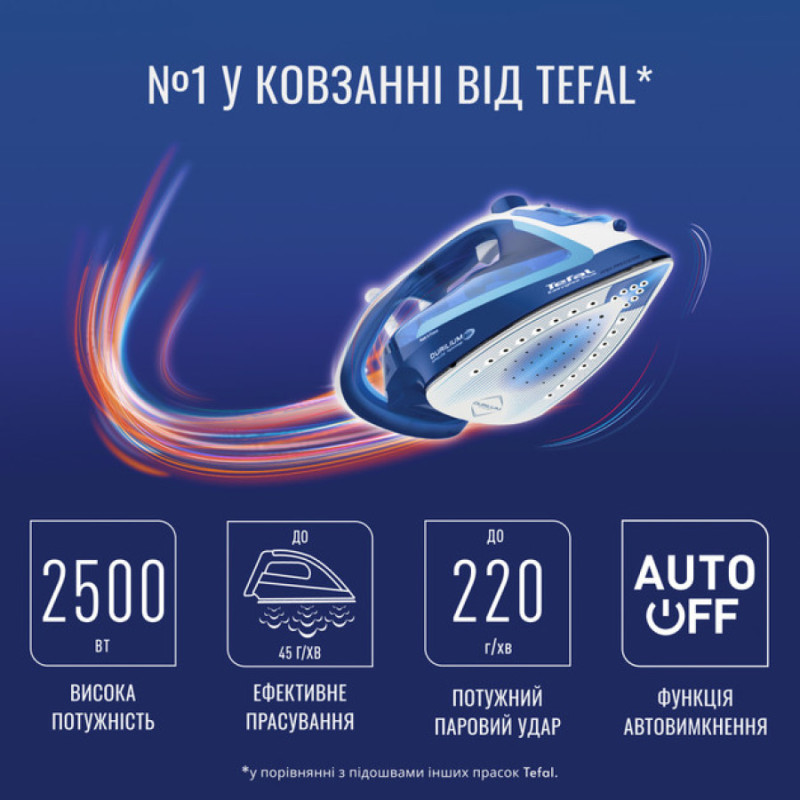 - Інтелектуальна система Automatic Steam самостійно підбирає оптимальну температуру та потужність пари. Просто виберіть тип тканини за допомогою перемикача, а все інше довірте праску Tefal.