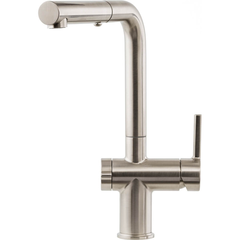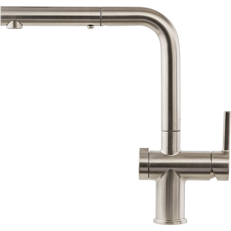 Змішувач із двома ручками управління, одна ручка до якої приєднується трос вентиля-ексцентрика. Витяжний вилив з функцією душу дає можливість ретельніше мити фрукти, ягоди, трави або салати. Змішувач може заощаджувати воду завдяки тому, що картридж має проміжне положення з неповним відкриттям. Ламінарний потік – легкий, тихий та прозорий потік води без розбризкування. Потік води – 7.5 л/хв (3 бар)