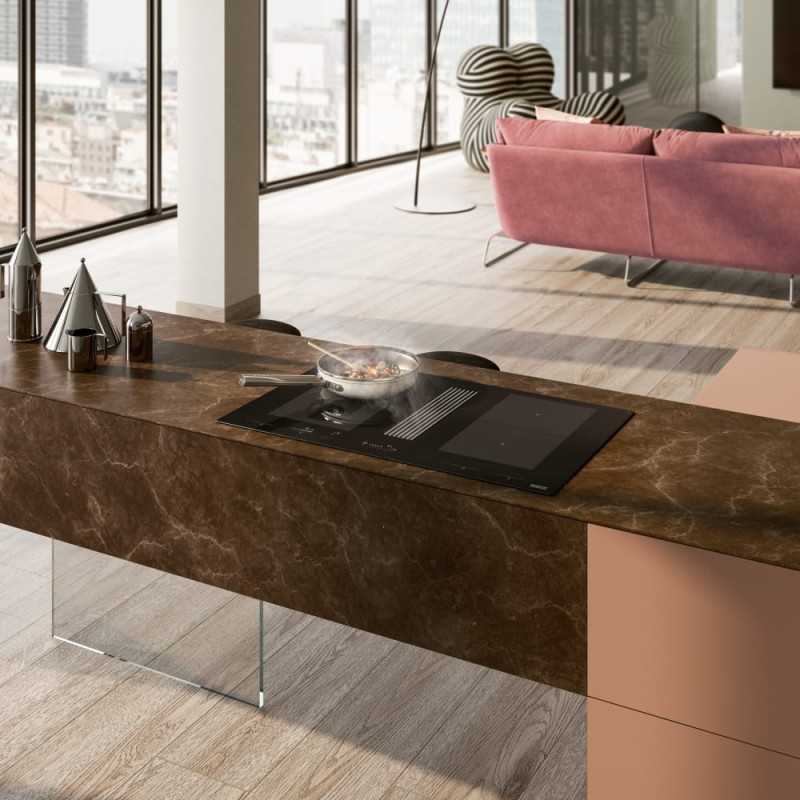 Варильна поверхня з інтегрованою витяжкою призначена для монтажу у режимі рециркуляції. Постачається з вугільним фільтром та набором для відведення повітря у задню стінку шафи.
