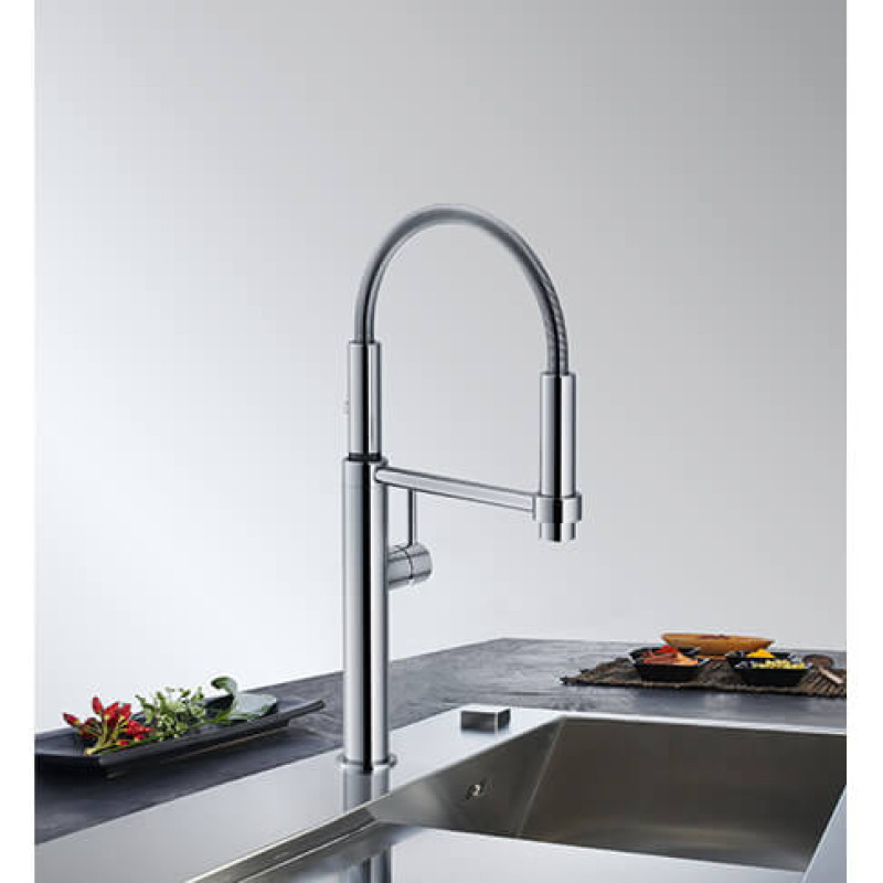 Змішувач з боковим розташуванням ручки управління. Гнучкий вилив дозволяє зручніше працювати із змішувачем. Також змішувач може перемикатися у режим душу. Змішувач може заощаджувати воду завдяки тому, що картридж має проміжне положення з неповним відкриттям. Потік води – 9.7 л/хв (3 бар)