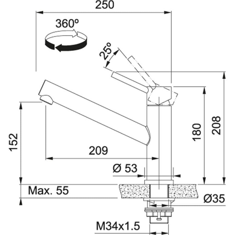 Смеситель с верхним размещение ручки управления. В среднем положении не смешивает воду, а подает только холодную, таким образом осуществляется экономия горячей воды. Имеет фиксированный излив, который не вытягивается. Смеситель может экономить воду благодаря тому, что картридж имеет промежуточное положение с неполным открытием. Ламинарный поток – легкий, тихий и прозрачный поток воды без разбрызгивания. Поток воды – 12 л/мин (3 бар)