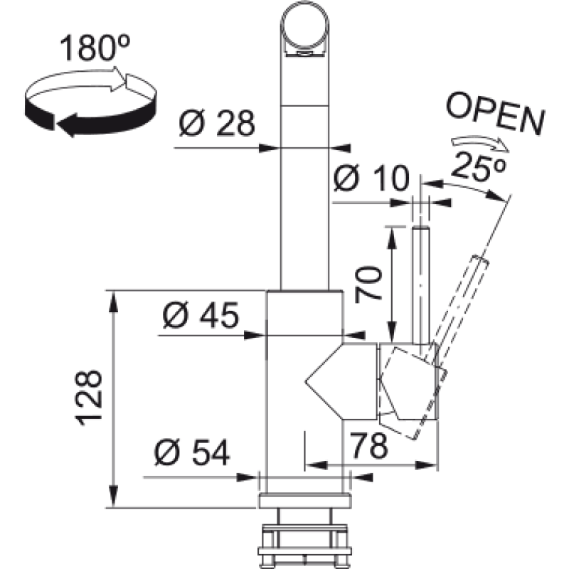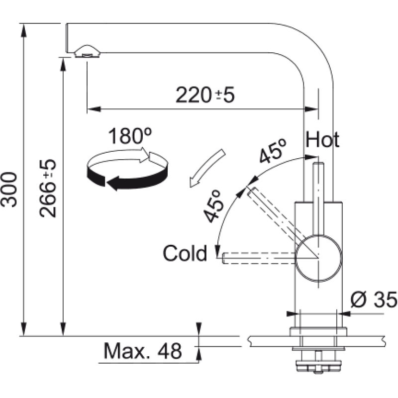 Смеситель с боковым размещение ручки управления. Имеет фиксированный излив, который не вытягивается. Ламинарный поток – легкий, тихий и прозрачный поток воды без разбрызгивания. Поток воды – 12 л/мин (3 бар)
