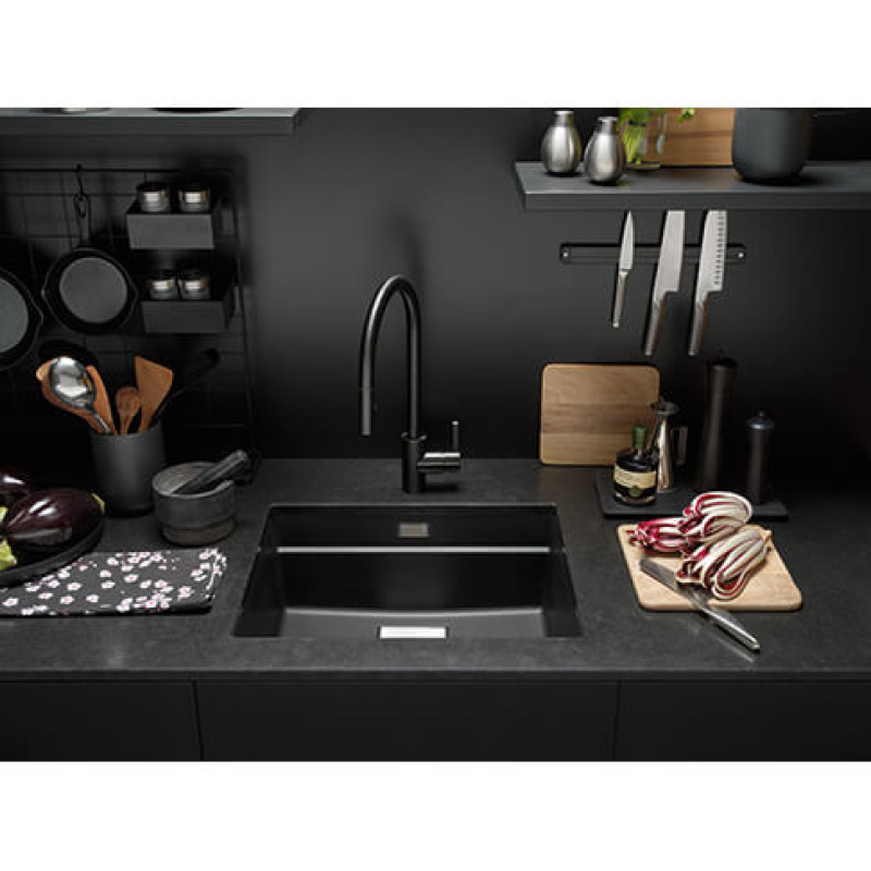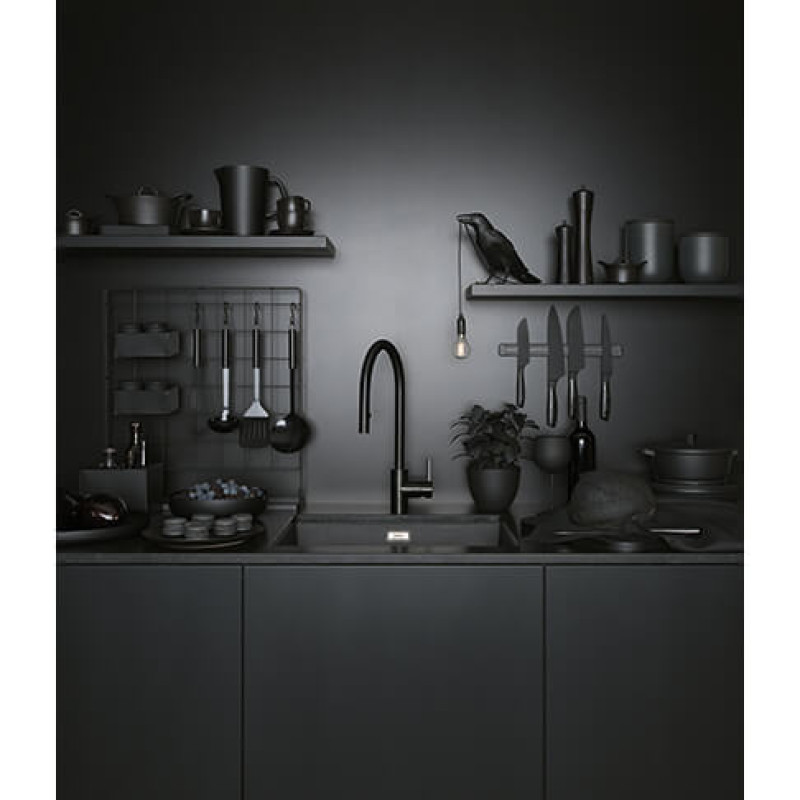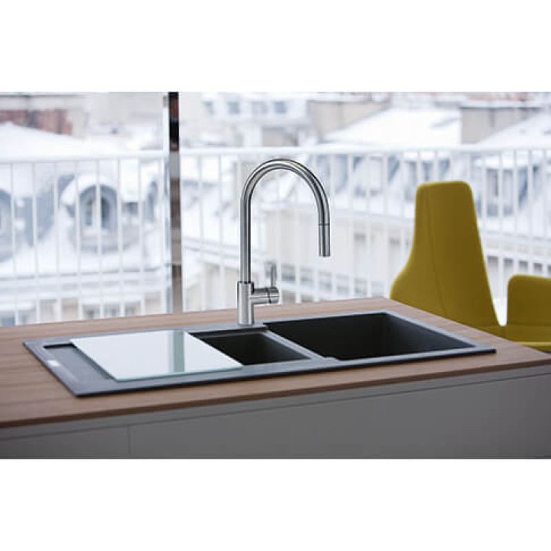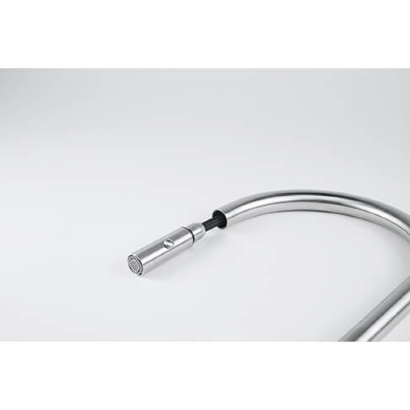 Змішувач з боковим розташуванням ручки управління. Витяжний вилив з функцією душу дає можливість ретельніше мити фрукти, ягоди, трави або салати. Ламінарний потік – легкий, тихий та прозорий потік води без розбризкування. Потік води – 8 л/хв (3 бар)