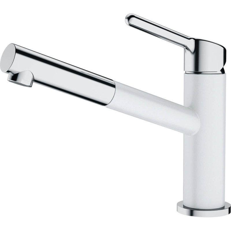 Змішувач із верхнім розміщення ручки управління. У середньому становищі не змішує воду, а подає лише холодну, таким чином здійснюється заощадження гарячої води. Витяжний вилив дає можливість заповнювати ємності поза чашею миття. Змішувач може заощаджувати воду завдяки тому, що картридж має проміжне положення з неповним відкриттям. Ламінарний потік – легкий, тихий та прозорий потік води без розбризкування. Потік води – 9 л/хв (3 бар)