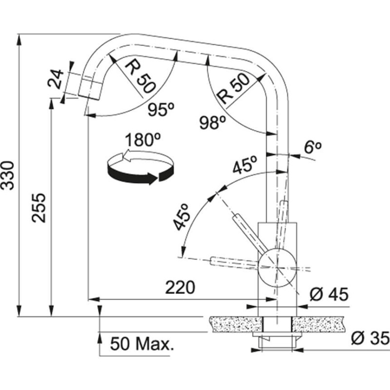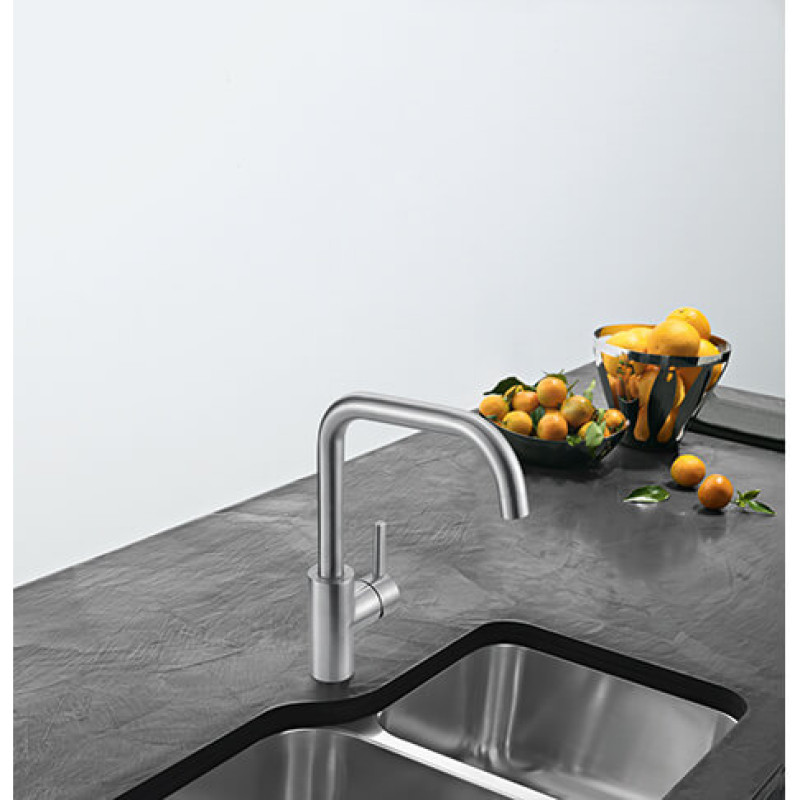 Змішувач з боковим розташуванням ручки управління. Має фіксований вилив, який не витягується. Ламінарний потік – легкий, тихий та прозорий потік води без розбризкування. Потік води – 12,2 л/хв (3 бар)