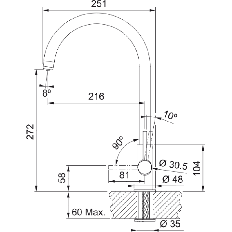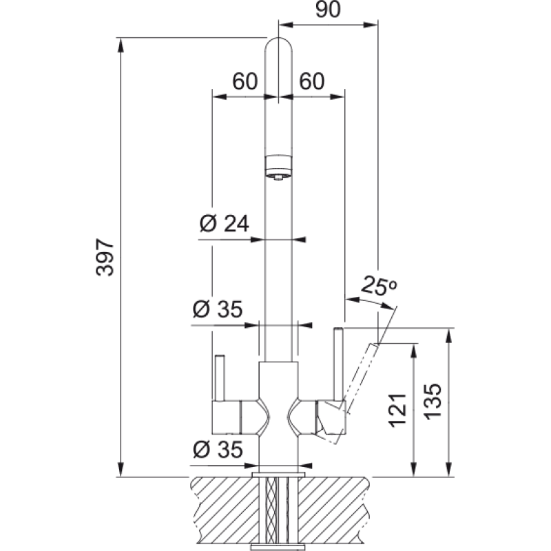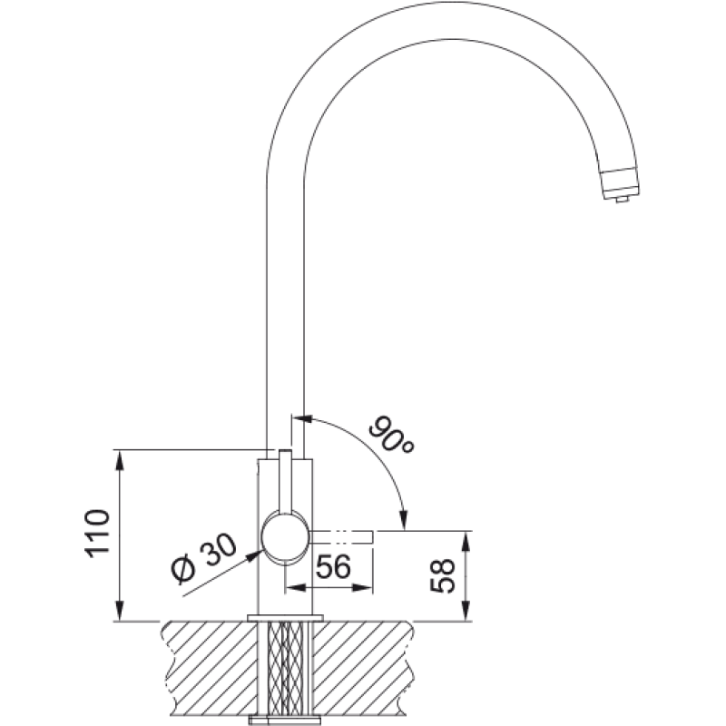 Кухонний змішувач з поворотним невитяжним виливом і бічним важелем керування в комплекті з фільтром для води. Кут повороту виливу складає 360° тому водяний потік досягає більшої площі мийки, а також такий змішувач можна монувати в острівні кухні. Обидва важелі відкиваються на кут до 90° вперед, тому змішувач можна монтувати впритул до стіни.