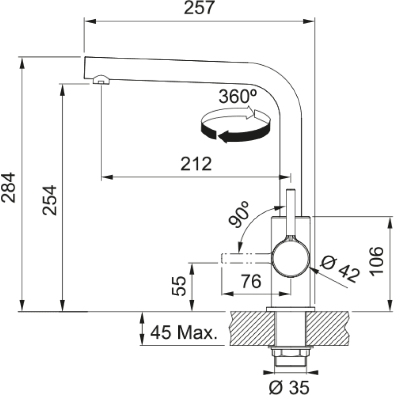 Кухонний змішувач з поворотним невитяжним виливом і бічним важелем керування. Важіль відкривається вперед на кут 90°, тому можна здійснювати монтаж впритул до стіни. Кут повороту виливу складає, 360° тому водяний потік досягає більшої площі мийки, а також такий змішувач можна монтувати в острівні кухні. Аератор насичує водяний потік повітрям, завдяки чому краще працюють миючі засоби а також економиться вода.