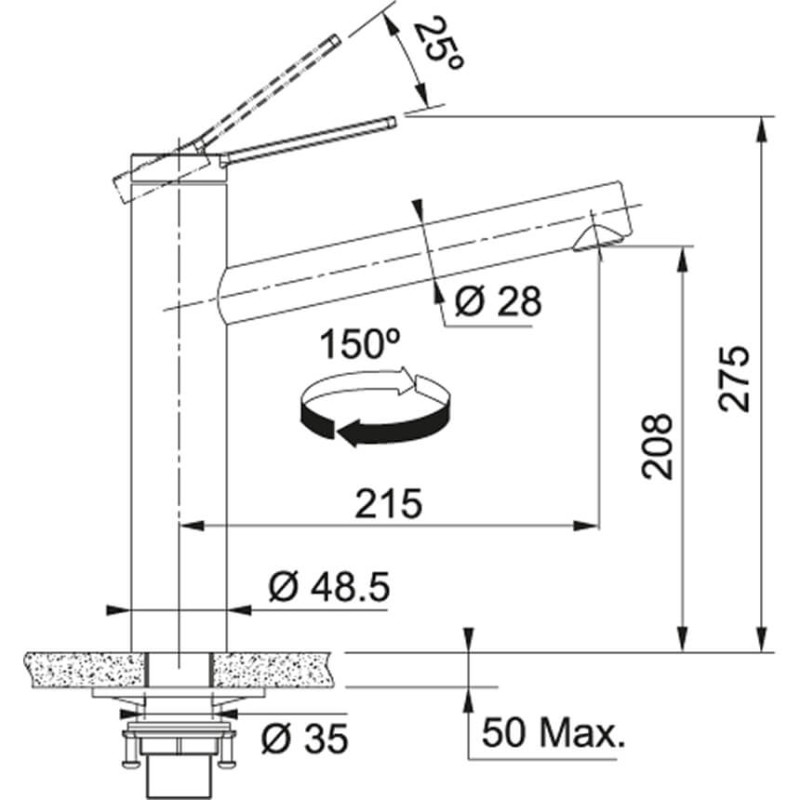 Змішувач із верхнім розміщення ручки управління. Має фіксований вилив, який не витягується. Змішувач може заощаджувати воду завдяки тому, що картридж має проміжне положення з неповним відкриттям. Ламінарний потік – легкий, тихий та прозорий потік води без розбризкування. Потік води – 12 л/хв (3 бар)