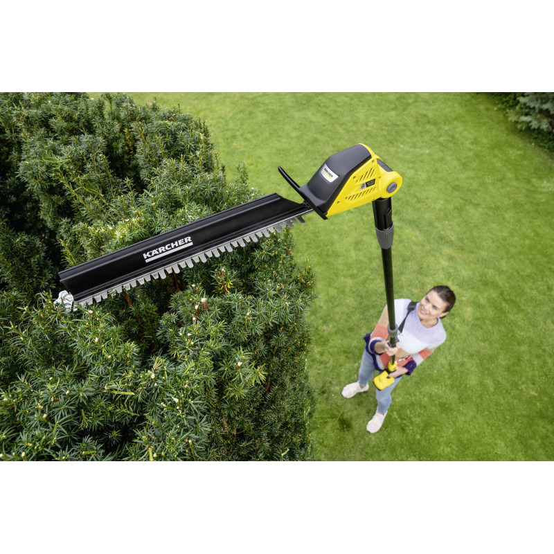 Високі чагарники і живоплоти нелегко утримувати в доглянутому стані. Допомогу в цьому надасть акумуляторний штанговий кущоріз Karcher PHG 18-45 Battery, радіус дії якого досягає 4 м. Цей інструмент дозволяє без використання драбини надавати рослинам витончену форму, при чому спеціальна знімна насадка для видалення зрізаного листя виключає потрапляння обрізків в середину крони, відводячи їх в сторону. Можливість відхилення ножа в секторі 115 ° забезпечує виконання будь-яких робіт в зручній позі і акуратну горизонтальну обрізку. Для тривалого виконання робіт без перевтоми передбачений плечовий ремінь, що зменшує навантаження на руки і плечі за рахунок оптимального перерозподілу ваги інструменту. Ніж з лезами алмазної заточки виконує також функцію пиляння - його передньою частиною можна без проблем розрізати навіть досить товсті гілки. Захисний елемент на кінці ножа запобігає випадкове пошкодження підлог, будівель і самих лез, а отвір в ньому дозволяє підвісити інструмент для акуратного зберігання в гаражі або сараї.